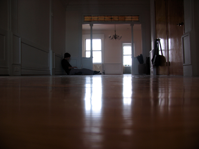 This is a picture of Toby sitting in our place fifteen minute before our stuff showed up. YES! Our stuff showed up. Can you believe it? As I write this, I am on a couch and James Spader is behind my monitor on the TeeVee. We have stuff. Now you can all come over.