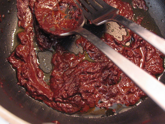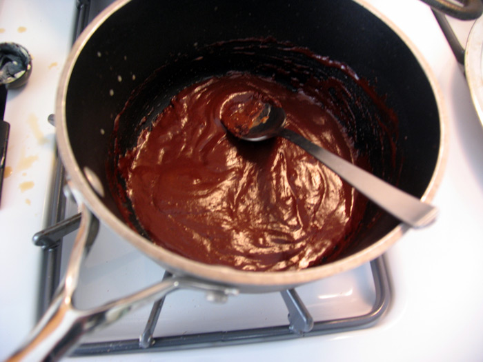 This is where I start to fuck up. I took a bar of Baker’s Chocolate and put it into the saucepan. I added some more sugar and then began to stir. I added some soy milk in desperation and then some water and then (after desperately hitting up the internets) some butter. And this happen: