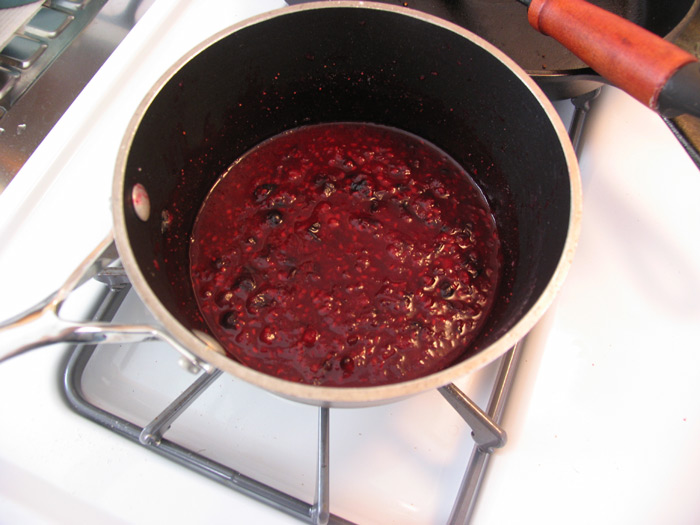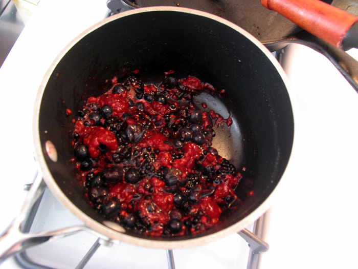 At first everything was going just fine. I made the crust just the same way I did yesterday. I put that in the oven and let it bake for a while. In the meantime, I put 3/4 of each tub of berries into a saucepan and began to mash them (with a masher, duh.) Here they are slightly mashed and just now on the stove.