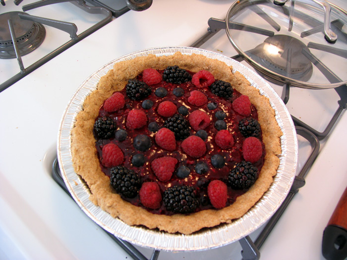 I took the reduced fruit and placed it into my pie crust. This is what it looked like before I put it back into the oven. I used the remainder of the berries (the 1/4 left of each) and decorated the top.