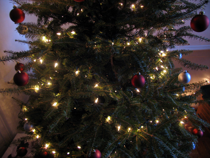 And here is our still very naked Christmas tree. I think we need more ornaments and some tinsel for Tucker to destroy come Saturday.
