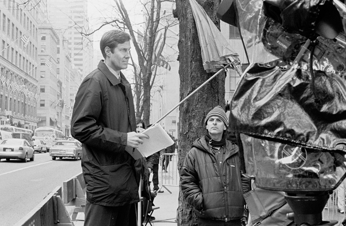 A newscaster mid-broadcast. The guy on the left looks to be silently judging him.