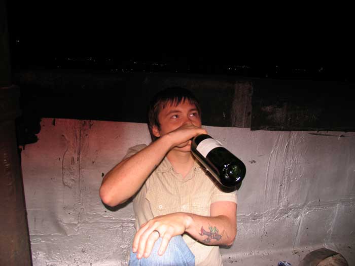 Toby Joe drinking wine at Sarah’s party. We couldn’t find any cups so we did it this way. That’s how we roll in our Hobo gear.