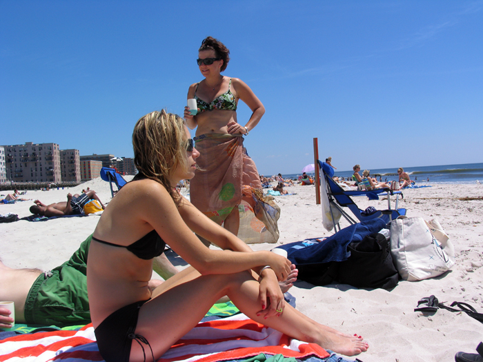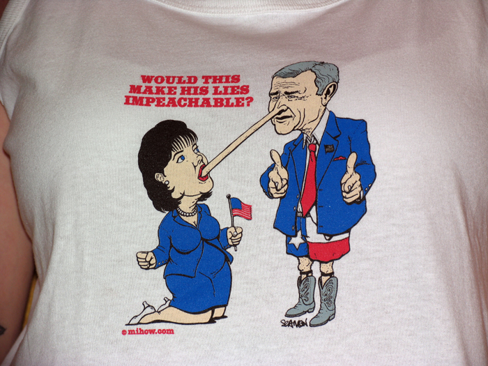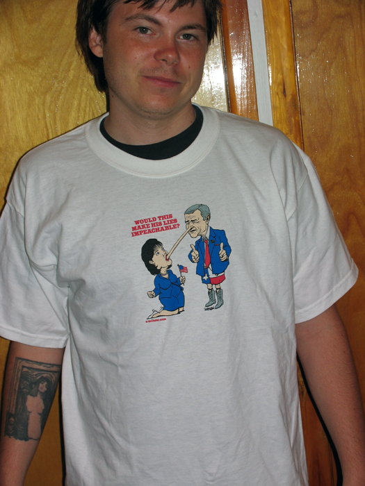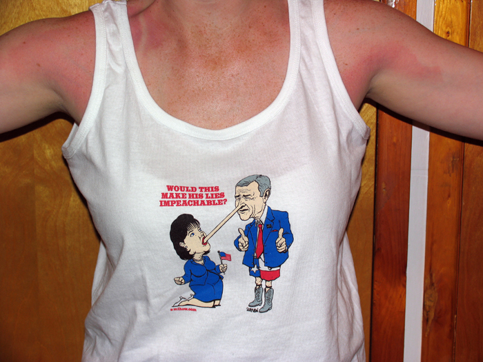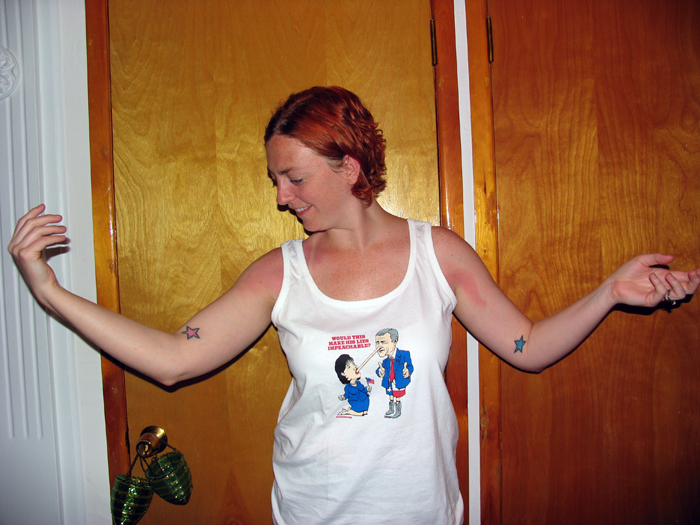 On Saturday, Gerry took us to the beach. We went to Long Beach. It has been confirmed that it was not the Long Beach de la Snoop. We went to Long Beach on Long Island. We got bagels, too. And we swam and ate food. I got a sunburn. Only, not everywhere like I usually do. Because apparently I am a grade-A moron when it comes to applying sunblock. And rest assured, if you were dumb enough to have me to apply sunblock to your body, you, too, ended up with splotches. (Sorry, Toby! Sorry, Gerry!) Below is an image of my splotchy sunburn as well as our new Bush T-Shirts.