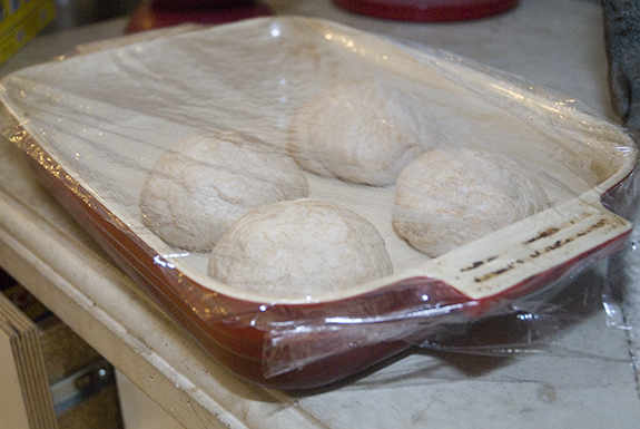 Remove the dough from the mixer and knead it for a bit on a lightly floured surface. Separate the dough into four balls. Place all four balls in a dish, cover it with saran wrap and refrigerate! You’re finished!