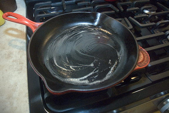 Heat up a skillet and coat it with a little bit of butter. (I usually wipe out the visible butter with a paper towel after it melts.)