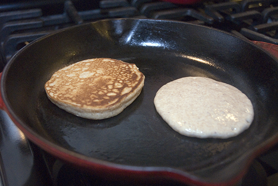 Drop some dough onto the pan, let one side cook until it bubbles a bit. Flip it over.  Let that side go for a while as well. That’s it. It’s really quite simple!