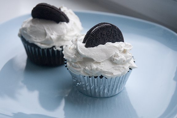 These cupcakes are pretty “mom-friendly” as is. The fluffiness of the icing makes them a cinch to ice and any icing mistakes are quite endearing—sweet nuances, if you will. So, go with it. And feel free to pile it on. I added enough to mine so I could securely fasten a Newman O to the top of each one.