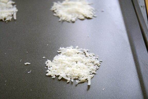 Grate some parmesan cheese into a bowl. Drop small mounds, 1 inch apart onto a nonstick cookie sheet. Mash those down using your fingers or the smooth side of a spoon. (Mine stuck to the spoon, I solved this problem by putting some parchment paper in between my fingers and the cheese.)