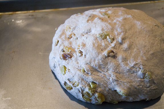 Remove the dough from the bowl and work it on a floured surface. Slowly begin kneading in the raisins and walnuts. It may seem a bit cumbersome at first, that’s normal. Just keep adding both items and as they fall out knead the bread overtop of any of those that were liberated. I promise, it works!