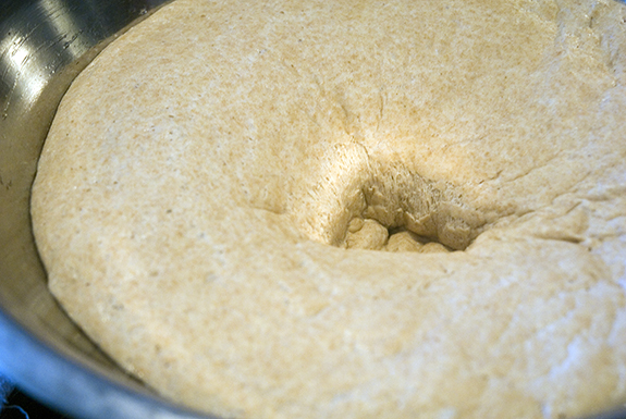 Place dough into a lightly oiled bowl. Let that sit for at least 1 1/2 hours. (Yesterday, I let mine sit for at least 2. We went into the city to try and help Em overcome his fear of the subway while it rised on the counter at home.)
