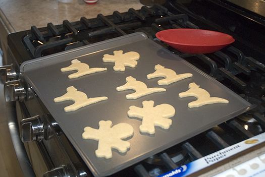 Roll your dough out on a parchment paper. It’s much easier to manage. Some people even bake the cookies on the parchment paper instead of peeling them off and transferring them to the cookie sheet. That also works, especially if you have delicate cookies (like the leg lamps!) These didn’t need that, though. They didn’t have too many areas conducive to tearing.