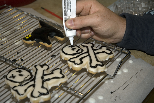 Add the eyes and faces. Finish the scary cookies! (Thanks to TobyJoe and his many years of practice drawing skulls and penises.)