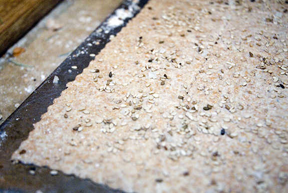 Coat the top with cold water. If you have a spray bottle, use that. I did not so I used my hand. Add seeds and salt (if using). If you feel like it, score the crackers. (I used a pasta roller for this.) Also, poke each square a few times with a fork.