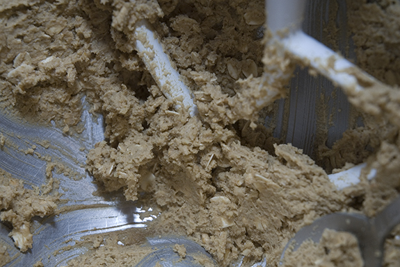 Add butter, sweeteners, bourbon or extract, and egg into the mixer. Stir it up until creamy. (It will likely be a wee bit lumpy. Normal.) In separate bowl, add all dry ingredients. Mix that up a bit with a spoon. Add it to the mixture. Until it looks a bit like this: