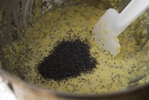 Add eggs, one at a time, beating between each one. Remove bowl from mixer. Add the poppy seeds.