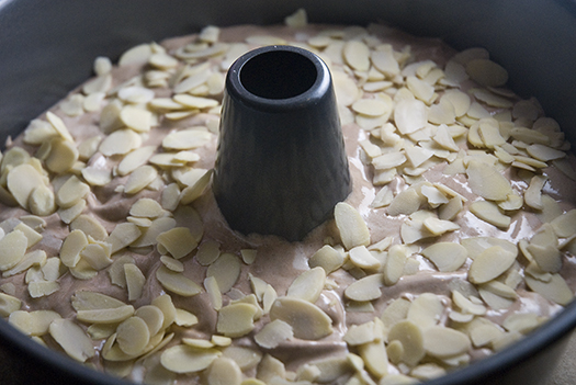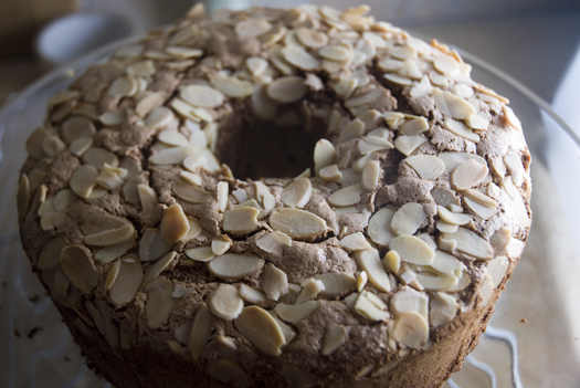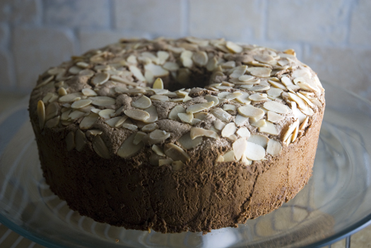 I always try and sprinkle the top of my angel food cakes because it covers up the cracks and other blemishes. :] I know. I cheat. But it also adds a wonderful flavor. The almonds come out slightly crunchy—so good! And they go really well with chocolate.