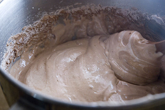 Slowly spoon in flour mixture about 1/4 cup at a time. (You can slowly beat this with your mixer using the flat beater attachment. Just go slowly.)