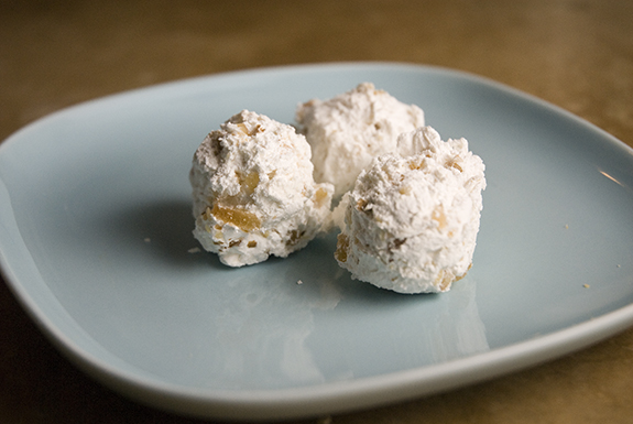 This is called Divinity. It’s apparently southern. I am not a fan of pistachios, which is what this recipe called for, so I used chopped walnuts and candied ginger instead. It’s delightful, believe it or not. :] I’m excited to do variations of this for the holidays. I picture some pretty great color combinations.