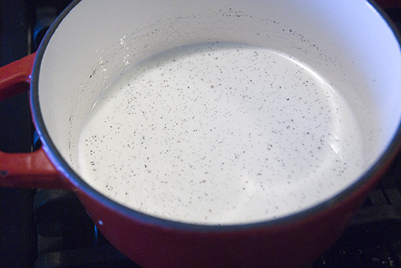 Combine half and half, sugar and scraped out vanilla bean in a saucepan.