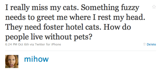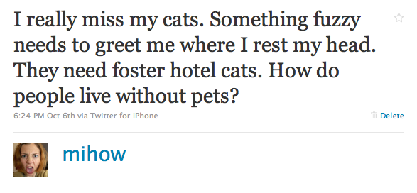We were away all last week, so we had a friend look in on our cats. Midway through the week, I started missing them something fierce. I missed having something fuzzy greet me at the door. I missed the snuggles that come with having a pet. I just missed them. So I decided to broadcast it.