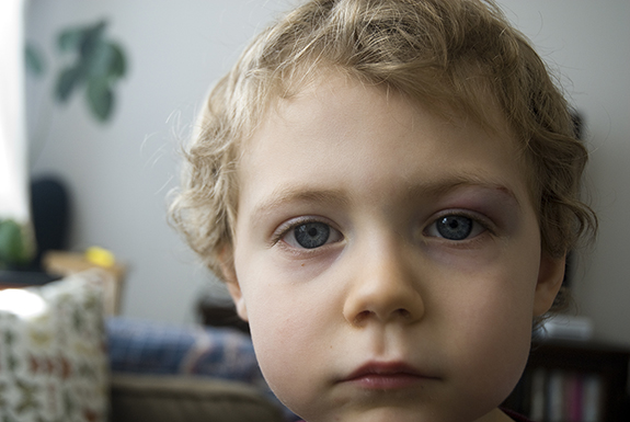 He got this jumping over a broomstick. At one point, he tripped and hit the coffee table. I had warned him, and should have stopped him like a good parent, but he was pretending to ski and was having a great time. I felt terrible.