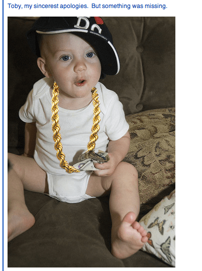 Incidentally, I feel a little gross photoshopping a tattoo onto a baby’s face. When he wakes up from his nap, I’m going to give him a big snuggle. And then throw him a few gang signs.