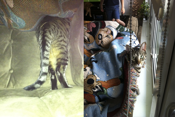 Emory has been building forts lately. He built one on our couch and then we went for a walk. When we got back, this was happening. (Inside view, outside view.) What a freak.