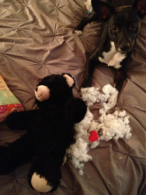Before you say, “Awwwww!” He was never attached to Tinka. He has stuffies that he loves; Tinka was just an acquaintance. So this isn’t as bad as it looks. In fact, I find it quite funny. Somehow the dog figured out how to dig the little heart right out of Tinka’s back. You see, at Build-A-Bear, they have the kid add a heart into its stuffing before sewing it up. I don’t know. I guess it’s supposed to make it feel more alive. I found it a little strange. And as a child, I probably would have dug the heart out as well—just knowing it was in there! I’d have liberated that heart. Maybe.