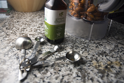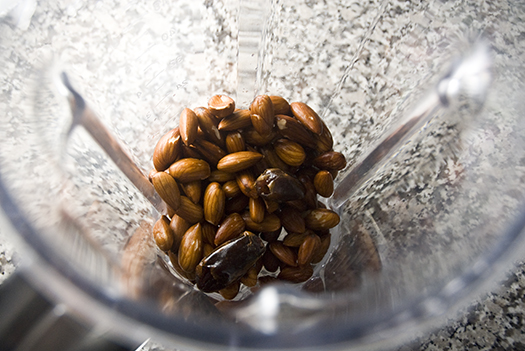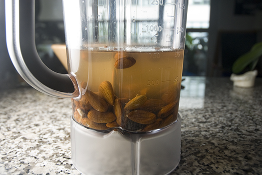 After the almond soak, strain the excess water and add the almonds to a blender. Add your dates (if using).
