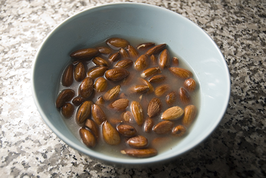 Pour a cup of almonds into a bowl. Add one cup of water and set it aside for at least 6 hours, or overnight.